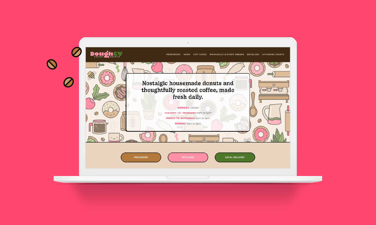 The Dough EV icon collection consists of over 20 different icons, with many in different variants (or flavours, if you will.) The full set is over 50 pieces, and includes multiple styles of donuts, tools + ingredients, the shop’s iconic coffee machine, and a turnip – an ode to The Root Cellar, a neighbourhood favourite cafe that used to operate out of the storefront where Dough Ev now lives. I used these on a wide variety of pieces for the shop, including social media assets, signange, a colouring sheet, an 8 by 7ft mural, and across the website.